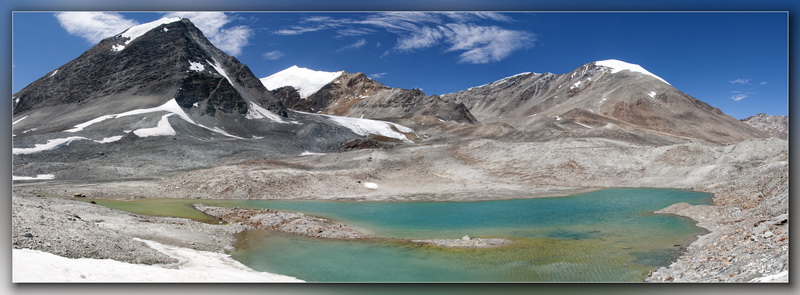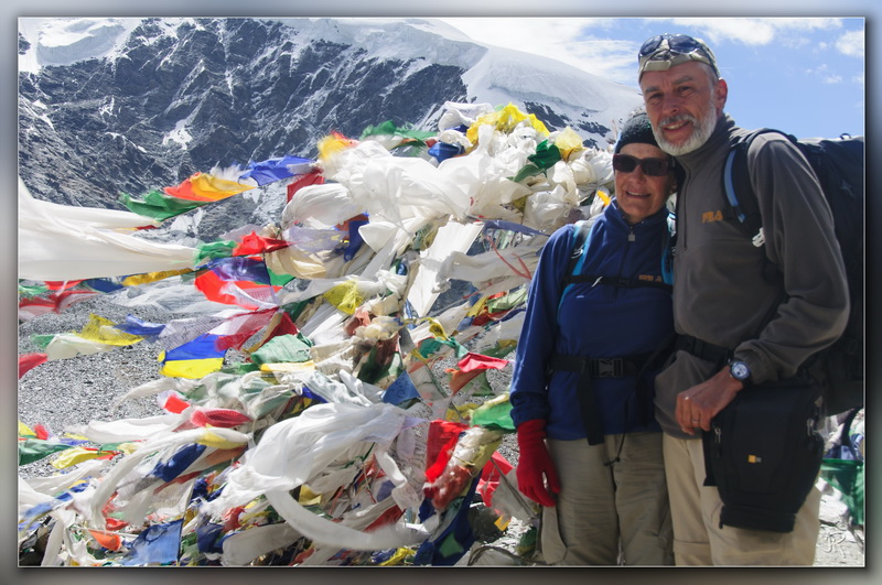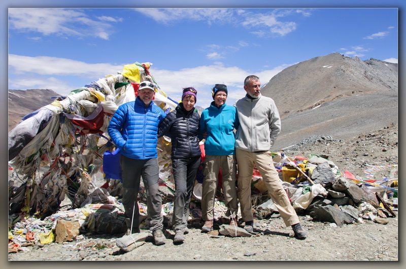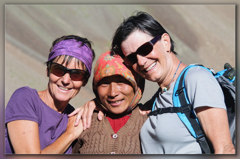 La première partie du parcours est relativement pentue durant une bonne heure puis se succèdent faux plats montants, franchissement de rivières et de névés pour arriver à la dernière montée dans un pierrier de type moraine bien casse pattes. Le sommet culminant à 5090 m est atteint sans trop souffrir, sauf pour Michelle qui y est arrivée à la force mentale. Petit moment d’émotion sur ce qui est désormais notre nouveau toit du monde… La descente sur Shumiknakpo est ponctuée de 3 franchissements de rivières aux débits forts respectables. Pour la première, on se mouille jusqu’aux cuisses dans de l’eau à 5°C max. Pour la deuxième, nos guides portent nos épouses sur le dos, les mecs se mouillent…