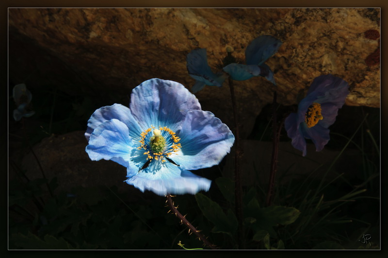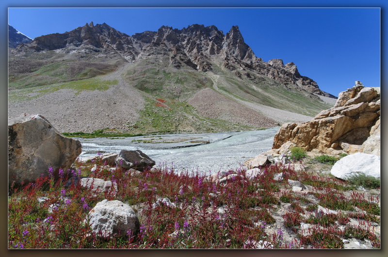 Comme tous les jours, un petit lunch chaud nous est servi à midi. Kell transporte le thermos contenant nos rations depuis le matin. Cette pose est l’occasion d’observer la flore de cette vallée magnifique. Edelweiss, gentianes, épilobes et surtout des pavots de l’Himalaya d’un bleu ciel incroyable …