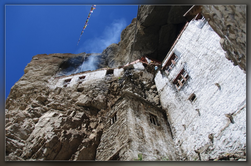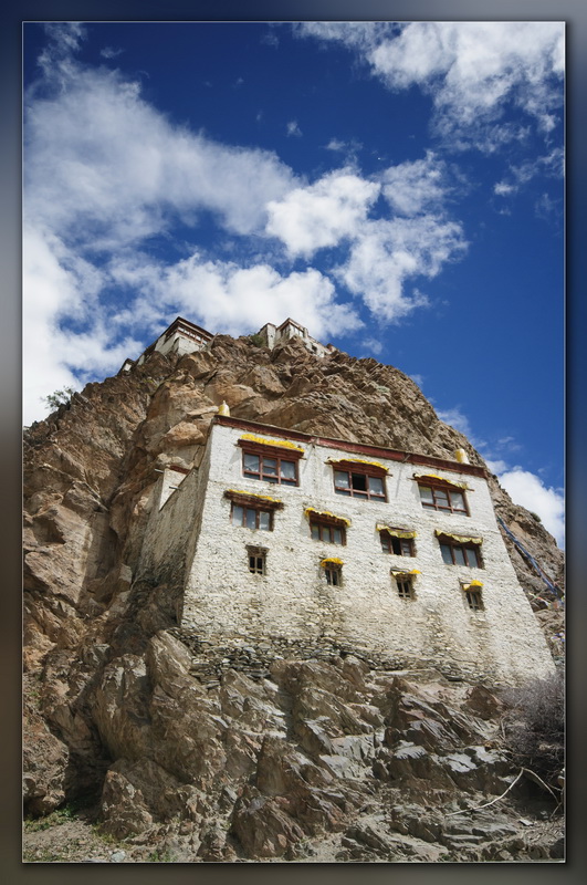 Aujourd'hui, un gros morceau ... le monastère de Phuktal, le plus connu et le plus ancien du Zanskar. Une cascade de petites constructions blanches qui semblent collées à la falaise entre ciel et rivière, ce "gompa" est le plus spectaculaire du Zanskar. Construit autour d'une grotte qui abrite une source sacrée ce monastère du XII°s accueille 80 moines de l'ordre Guélugpa, appelés aussi "bonnets jaunes". Autour du temple aux murs rouges s'accrochent les cellules blanches des moines.