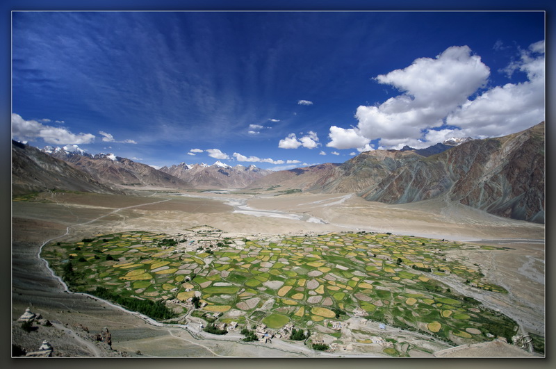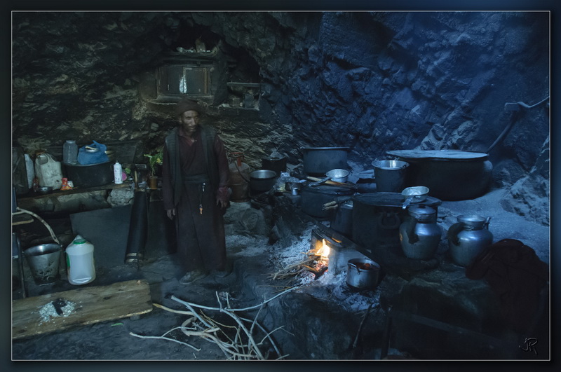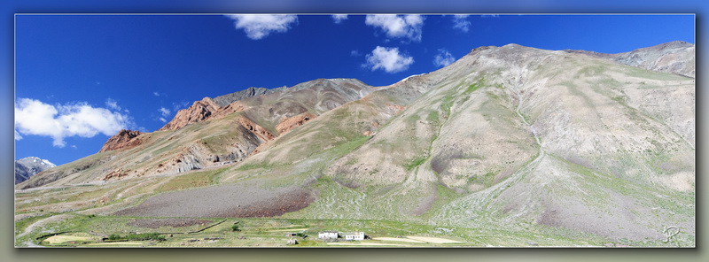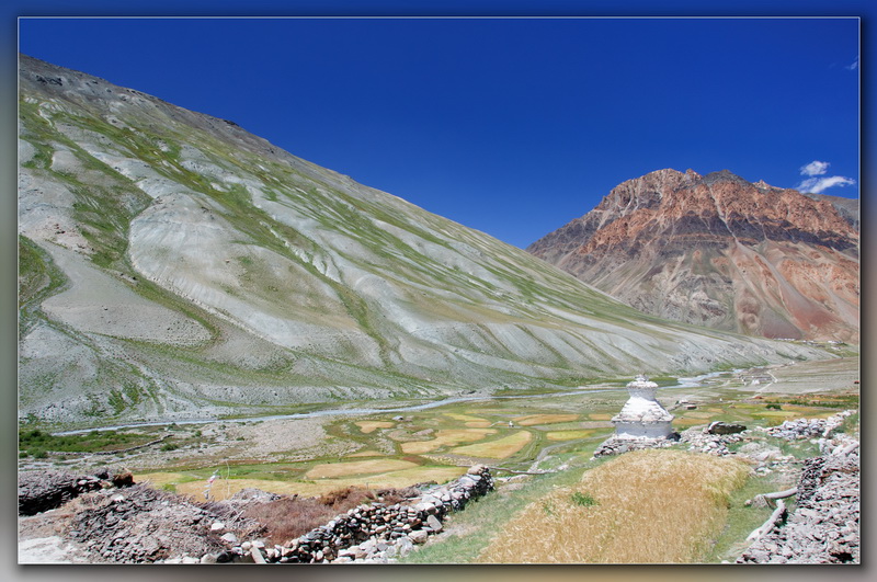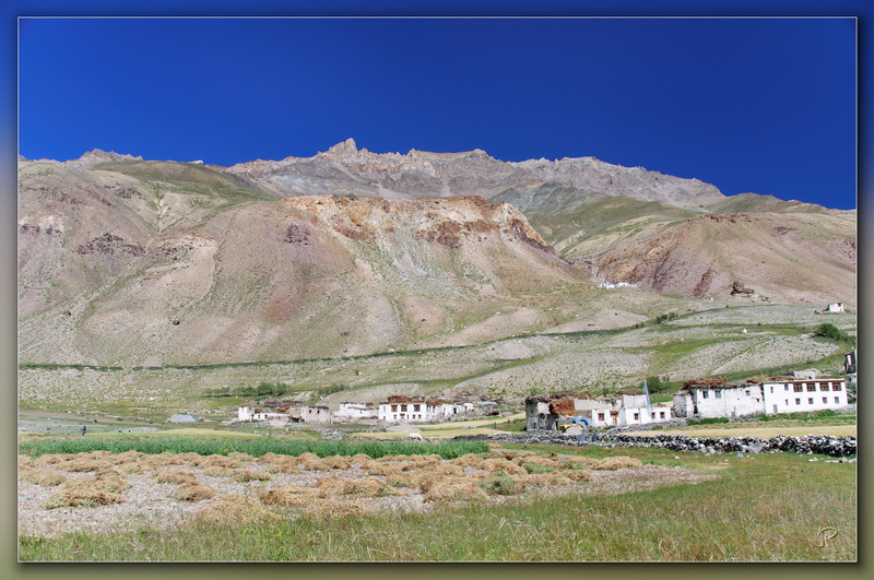 Un parcours qui débute par une montée abrupte de 40 minutes. Nous voila chauds pour la journée. La suite du trajet est un long faux plat montant vers le très joli village de Testa où nous sommes invités à partager un thé chez un ami de Kell. Un policier de Leh en vacances dans son village natal pour aider sa famille à préparer l'hiver. Récolte du seigle, des petits pois et de la bouse de yack séchée pour alimenter le seul fourneau de la maison servant au chauffage et à la cuisson.